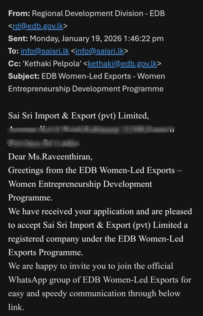 On January 19, 2026, Sai Sri Import & Export (Pvt) Ltd achieved a significant milestone — being officially selected under the EDB Women-Led Exports – Women Entrepreneurship Development Programme.