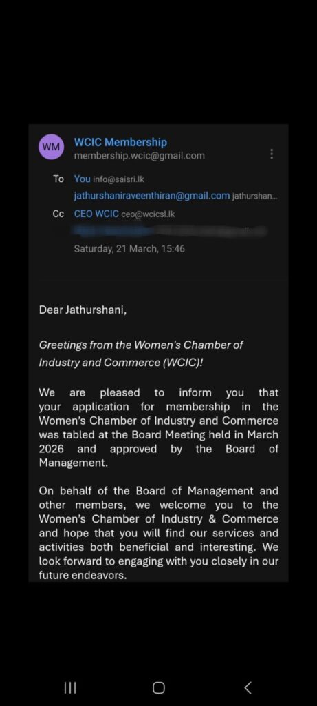 On March 21, 2026, Sai Sri Import & Export (Pvt) Ltd achieved another important milestone — being officially approved as a member of the Women’s Chamber of Industry and Commerce (WCIC).